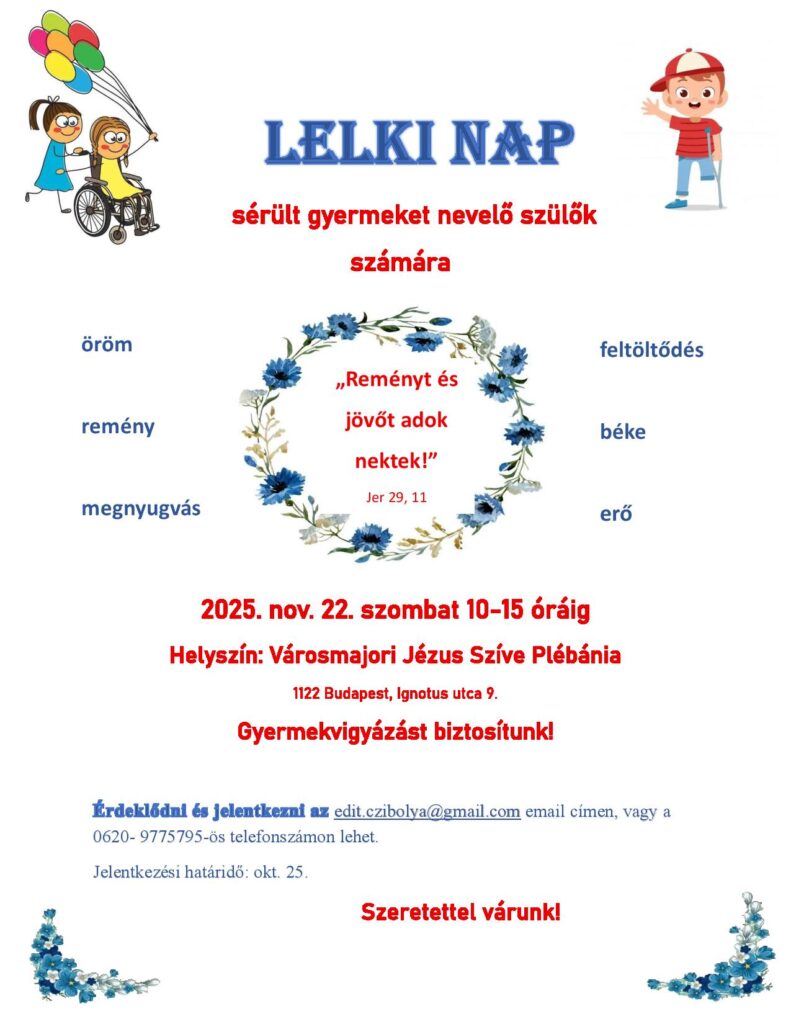 Lelki napot tartanak sérült gyermeket nevelő szülők számára a Városmajori Jézus Szíve Plébánián, november 22-én, szombaton 10-től 15 óráig, melyre szeretettel várják az érintetteket. Érdeklődni és jelentkezni az edit.czibolya@gmail.com címen, vagy a 20-9775795-ös telefonszámon lehet.