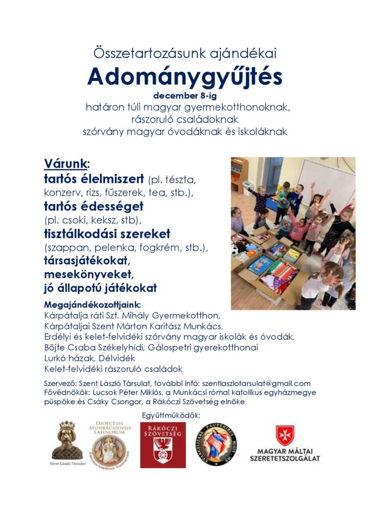 Plébániánk idén is bekapcsolódik a Szent László Társulat és a Rákóczi Szövetség által szervezett karácsonyi ajándékgyűjtésbe, melynek során határon túli magyar óvodákat és iskolákat, gyermekotthonokat és családokat ajándékozhatunk meg. Tartós élelmiszert és édességet, tisztálkodási szereket, mesekönyveket, társasjátékokat és egyéb jó állapotú játékokat gyűjtünk, ruhát és plüssjátékot nem! Az adományokat mostantól kezdve december 8-a hétfő estig lehet hozni a gyóntatóhelyiségek előtti kék üveges részre. Köszönjük szépen!