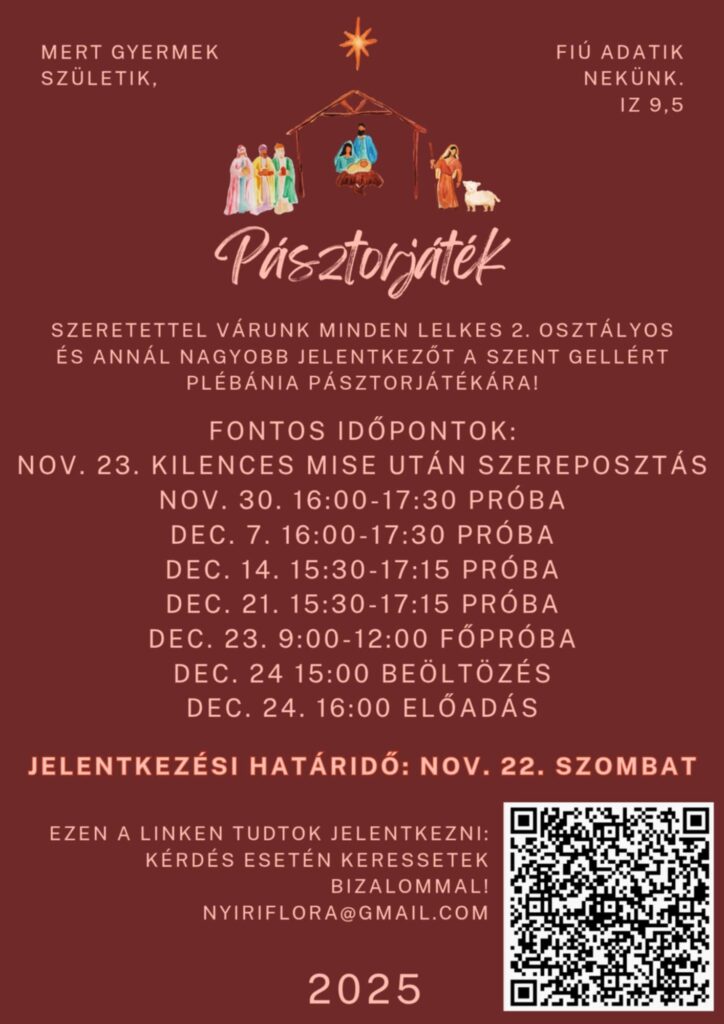 Idén ismét lesz karácsonyi pásztorjáték templomunkban december 24-én du. 4 órakor, melynek előadásához szeretettel várunk szereplőnek iskolás korú (2. osztályos vagy nagyobb) gyerekeket és fiatalokat! A próbák időpontjai az alábbi plakáton láthatók. Jelentkezni a plakáton lévő QR-kód segítségével lehet november 22-e szombatig. Az első, szereposztó próba november 23-án vasárnap, a 9-es mise után lesz.