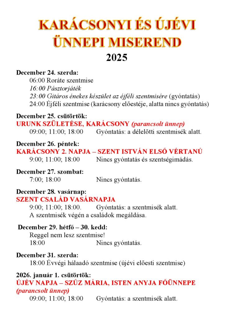 Hétfőn, kedden és szerdán (december 29-én, 30-án és 31-én) csak az esti szentmisék lesznek megtartva templomunkban, amelyek kivételesen este 6 órakor kezdődnek. Ezeken a napokon nem lesz gyóntatás.
