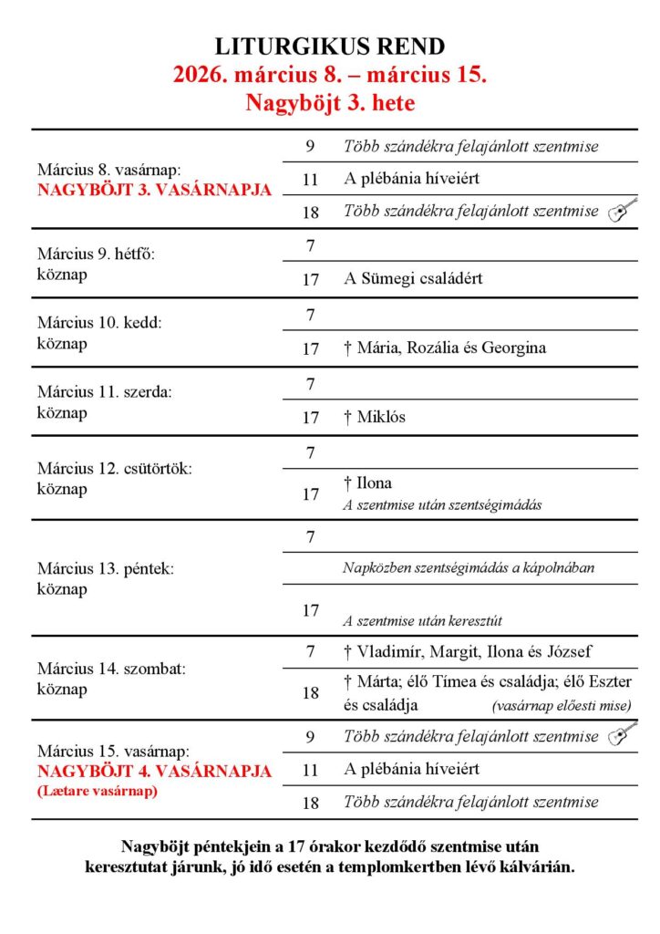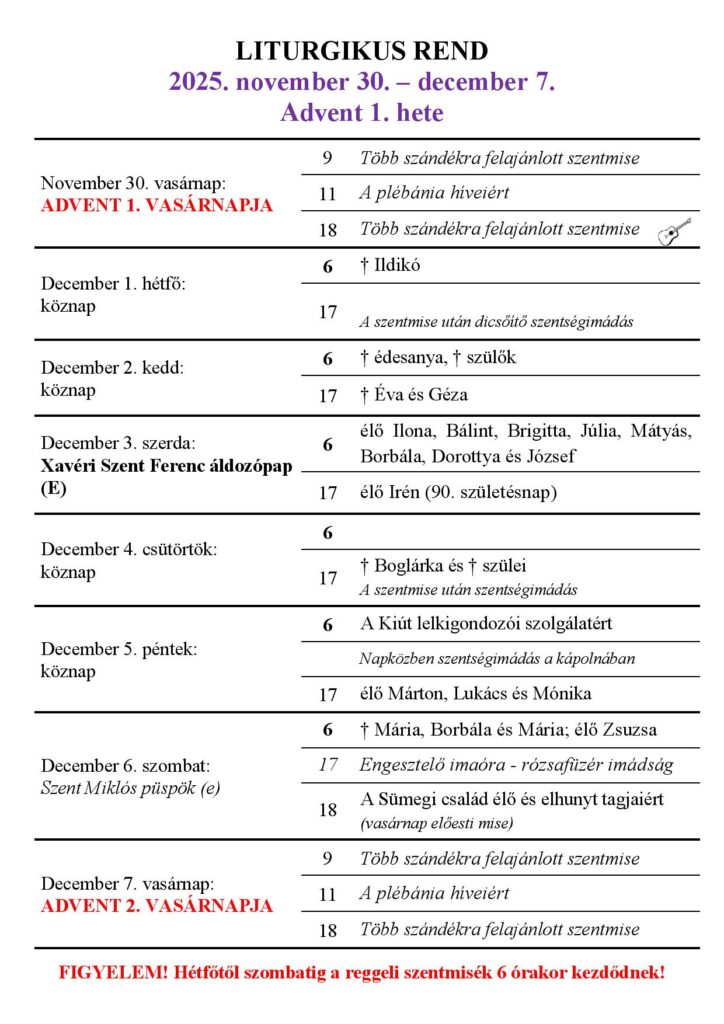 Liturgikus rend Templomunk aktuális heti liturgikus rendje: FÜ: főünnep; Ü: ünnep; E: kötelező emléknap; e: választható emléknap. Templomunk általános miserendje Gyóntatási rend Szentségimádások rendje