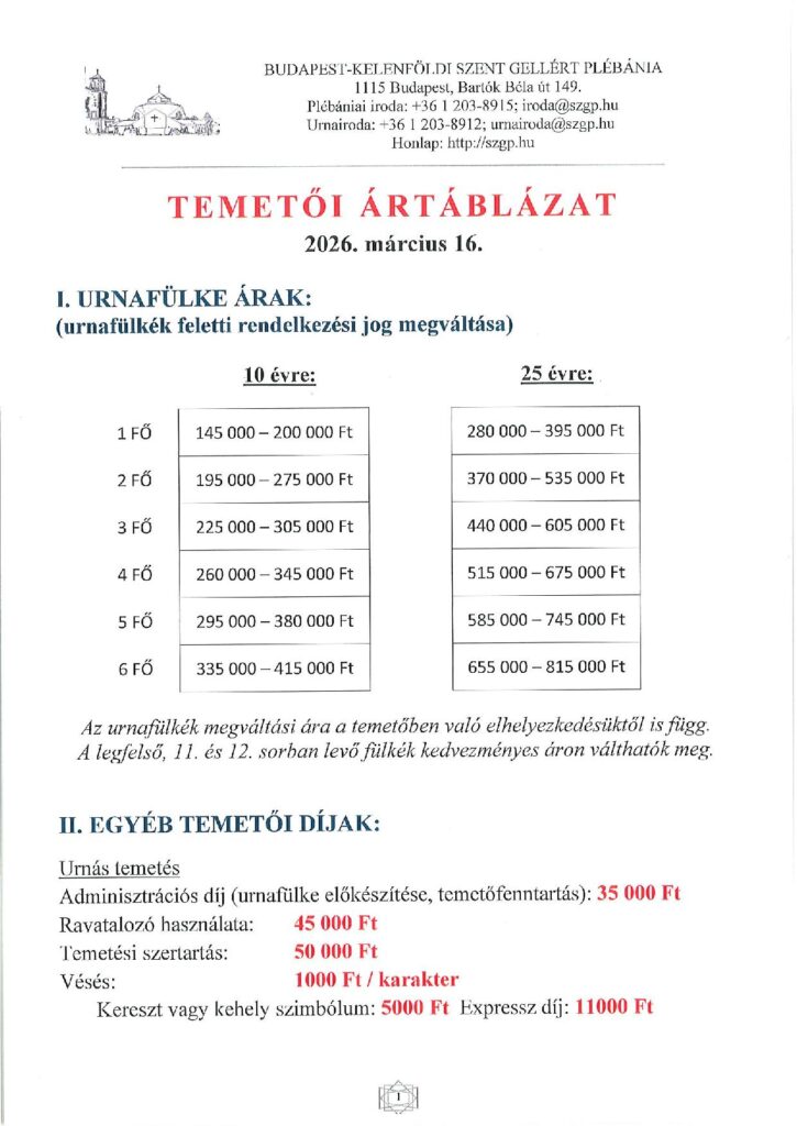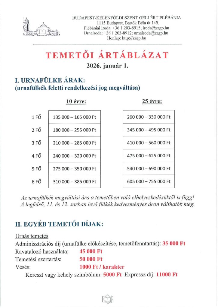 A Szent Gellért Plébánia irodáiban (Plébániai iroda és Urnairoda) a fizetés készpénzzel vagy banki átutalással lehetséges. Adatok a banki utaláshoz: Szent Gellért Plébánia; 11711034-20021290 (OTP)